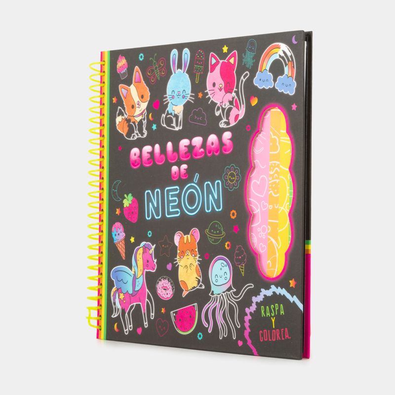 Usa la maravillosa herramienta para raspar y descubrir las imágenes de este libro. Echa a volar tu creatividad artística con estas figuras brillantes y las páginas para colorear ¡Te divertirás en grande con estas imágenes de neón!