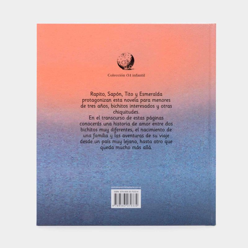 En el transcurso de estas páginas conocerás una historia de amor entre dos bichitos muy diferentes, el nacimiento de una familia y las aventuras de su viaje desde un país muy lejano, hasta otro que queda mucho más allá. Rapito, Sapón, Tito y Esmeralda protagonizan este cuento para menores de tres años, bichitos interesados y otras chiquitudes.